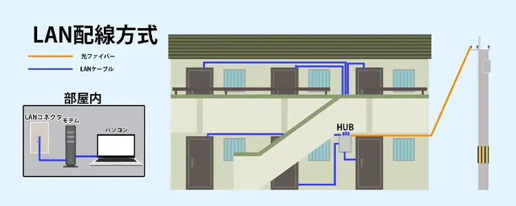 外部から建物に設置されたHUBまでは光ファイバーを引き込みますが、HUBからはLANケーブルで各部屋まで引き込まれます。