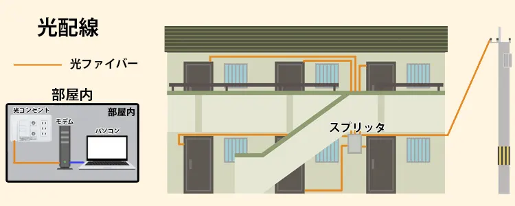 光回線導入済み物件の場合、建物の共有分に設置された分配器までは光ファイバーがすでに引き込まれています。