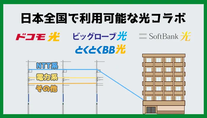 光コラボは多くのサービス(ドコモ光、ソフトバンク光、ビッグローブ光、とくとくBB光等)があり自分に合った光回線を見つけやすいです。