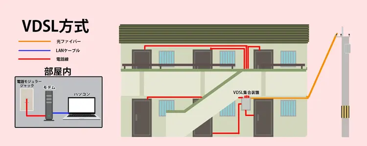外部からVDSL集合装置までは光ファイバーですが、VDSL集合装置から各部屋までは既存のメタル線(電話線)を使用します。