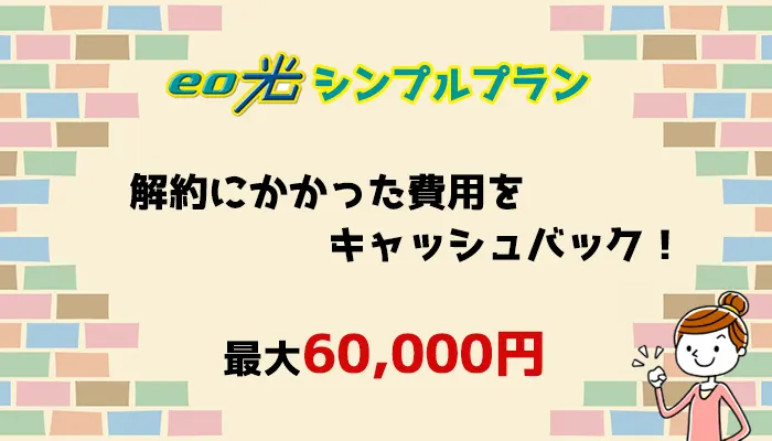他社からeo光に乗り換える際、解約にかかる費用を最大60,000円まで還元してもらえるキャンペーンです。