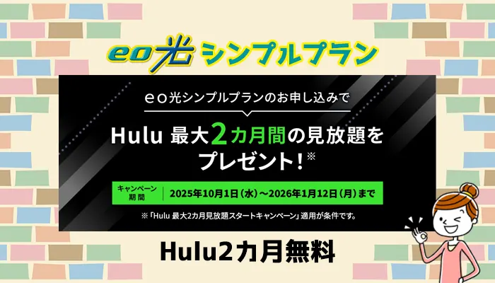 キャンペーン期間中にeo光シンプルプランに申し込むと、動画配信サービスHuluが最大2カ月間無料で利用できます。