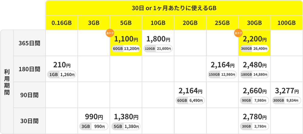 | 30ギガ(35ギガ) | 2,700円(1,350円) |