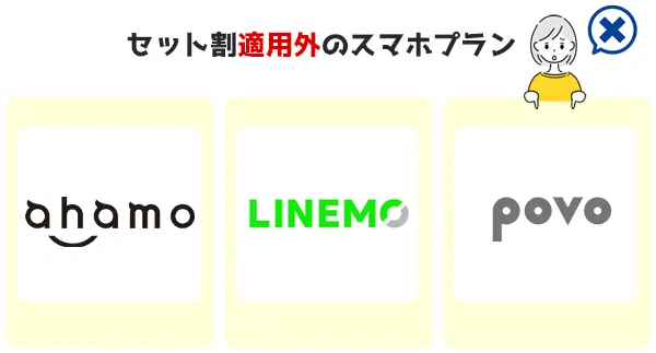 ahamo、LINEMO、povoなどのオンラインプランはセット割対象外です。