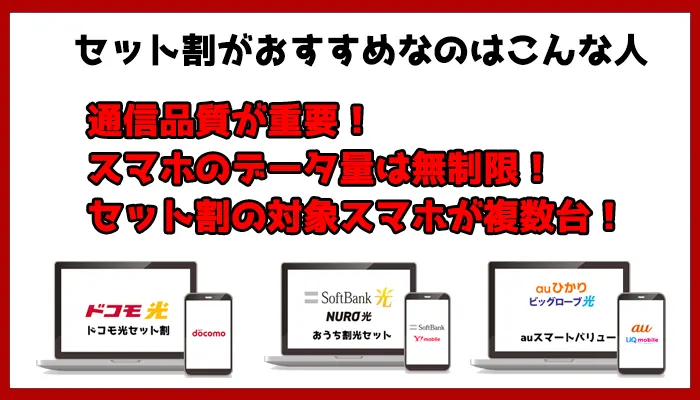 セット割がお得なことに嘘はありませんが、近年低価格な光回線が増えてきていることや、スマホの料金プランの多様化によりセット割よりもお得な光回線の選び方があります。