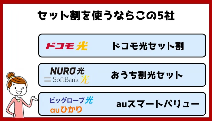 それぞれのセット割で割引額や対象など異なります。