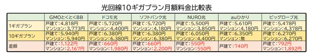 | au | auひかり+使い放題MAX | GMOとくとくBB光+楽天モバイル | 差額 |