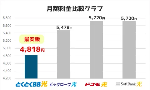 比較グラフでもわかる通り、戸建てであれば他社が5,000円台ですが、とくとくBB光は4,818円と格安です。