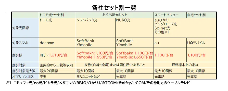 | ドコモ光セット割 | おうち割光セット | スマートバリュー | |