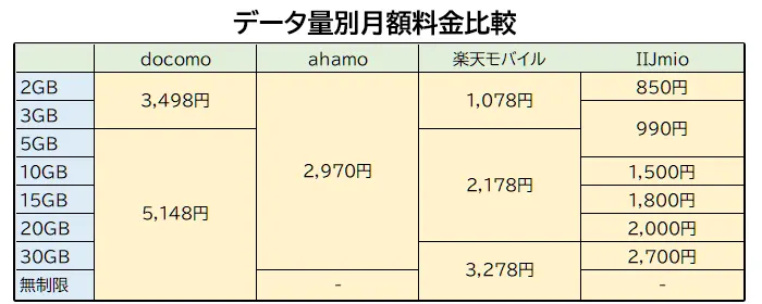 IIJmioは契約プランが多くありますが、最低の2ギガプランなら他のスマホよりも低価格です。