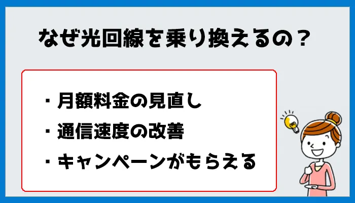 光回線を乗り換えることで通信環境が良くなったり、キャッシュバックがもらえるなどメリットは豊富にあります。