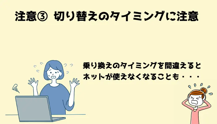 また何らかの理由で乗り換え先の工事が出来ないとさらにネットの利用できない期間が長くなってしまうので、ネットが使えないのは困るという方は旧回線の解約時期は注意してください。