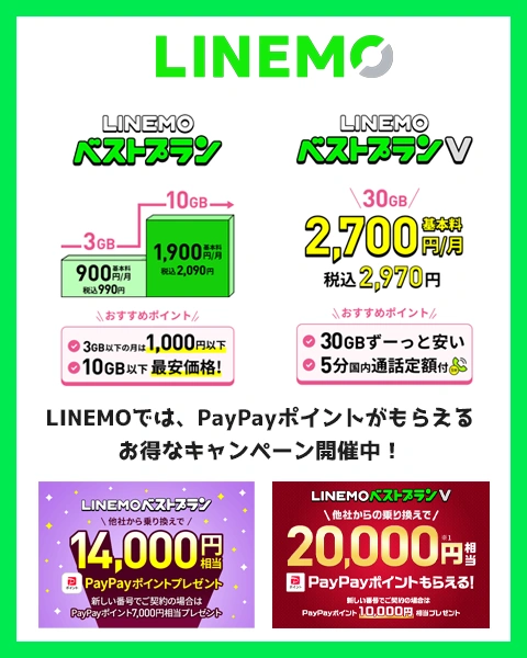 他社から乗り換えでLINEMOベストプランV契約で最大20,000円相当のPayPayポイントがもらえるキャンペーンを筆頭に、お得なキャンペーンを開催中です。