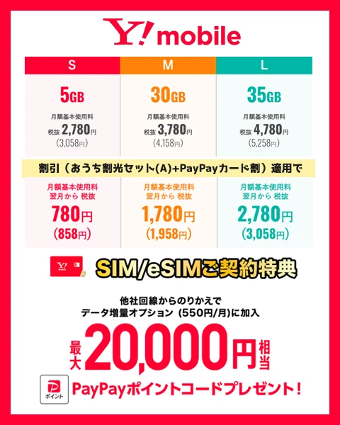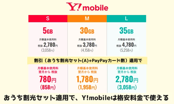 Y!mobileは基本料金は少し高めの設定ですが、光回線とのセット割(おうち割光セット(A))及びPayPayカード割を適用すると、5GBが月額858円、30GBが月額1,958円、35GBが月額3,058円と、どのプランも実は格安料金で利用することが可能です。