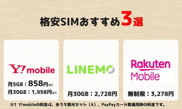 ※Y!mobileは、各種割引適用時の料金です。通常料金は5GB3,058円です。
