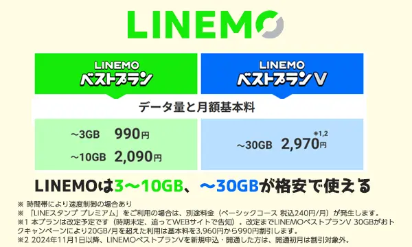 プランは2つ用意されており、LINEMOベストプランは月3GBが990円、月3GB~10GBが2,090円、LINEMOベストプランVは月30GBが月額2,970円にて利用可能です。