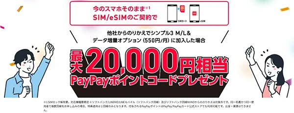 ※ データ増量オプション(550円/月)に加入しない場合特典は適用されません。ソフトバンク/LINEMO/LINEモバイル(ソフトバンク回線)及びソフトバンク回線MVNOからののりかえは対象外です。同一名義かつ同一使用者で複数回線をお申し込みの場合、特典適用は1回線のみとなります。付与されるPayPayポイントはPayPay公式ストアでも利用可能です。出金・譲渡はできません。プレゼント金額はすべて非課税。