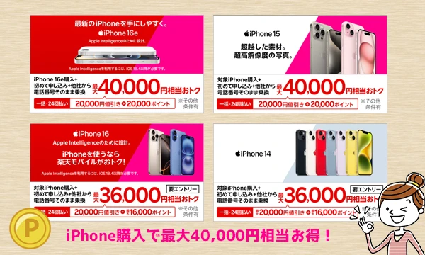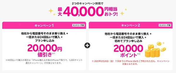 | iPhone 16eキャンペーン!最大40,000円相当還元 | iPhone 16e購入で最大20,000ポイント還元、さらに対象機種は2万円割引 |