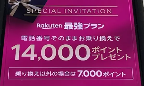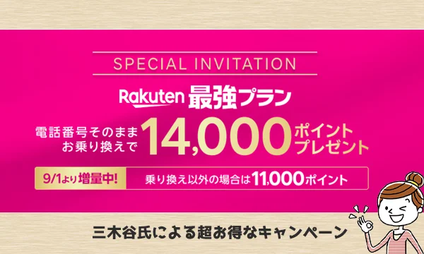 特別キャンペーン(三木谷キャンペーン)!過去に契約してた方も対象!乗り換えで14,000ポイント、新規は11,000ポイントもらえる