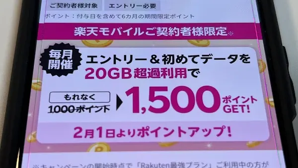 | 【要エントリー】はじめてデータを20GB超過利用で1,500ポイントプレゼント | 楽天モバイルにて、月20GBを初めて超過利用したら1,500ポイント還元 ※エントリー必要 |