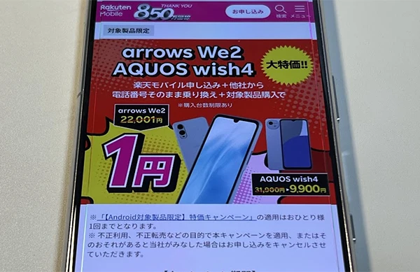 | 楽天モバイルお申し込み&対象製品ご購入で最大22,000円値引き! | arrows We2/AQUOS wish4が22,000円の割引価格で購入可能 ※arrows We2は端末代1円 |
