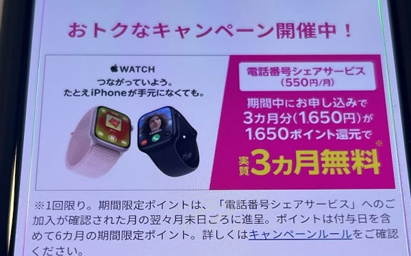 1つの電話番号をiPhoneとApple Watchにて共有できる「電話番号シェアサービス」に加入で1,650円相当の楽天ポイントがもらえます。