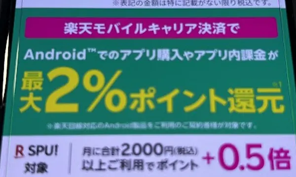 | 楽天モバイルキャリア決済でAndroidアプリ購入・アプリ内課金が最大2%分還元キャンペーン | Androidアプリ購入・アプリ内課金を楽天モバイルキャリア決済で行うと、最大2%分ポイント還元 |