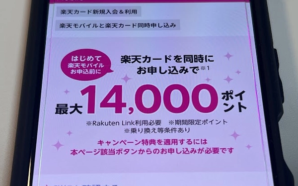 | 楽天カード同時申し込みで最大14,000ポイントプレゼント | 楽天モバイルと楽天カード同時申し込みで、最大14,000ポイン還元 |