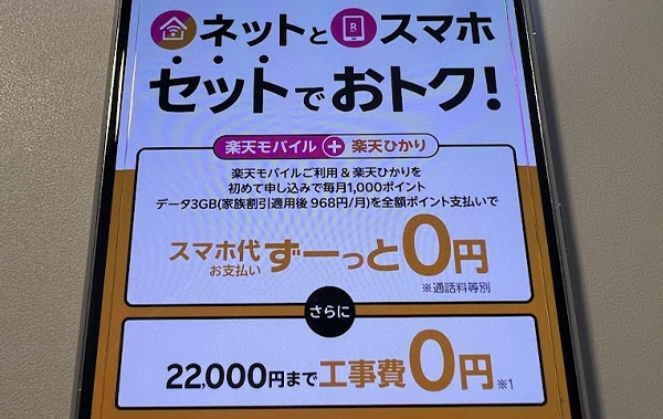 | 楽天ひかり工事費実質無料&毎月1,000ポイントもらえる | 楽天モバイルユーザーが楽天ひかり契約で工事費が実質無料、さらに毎月1,000ポイント還元 |