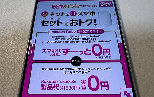 | Rakuten Turbo(ホームルーター)契約で端末代実質無料&毎月1,000ポイントもらえる | 楽天モバイルユーザーがRakuten Turbo契約で端末代実質無料、毎月1,000ポイント還元 |