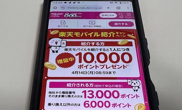 | 楽天モバイル紹介キャンペーン! | 紹介した人10,000ポイント、紹介された人13,000ポイントもらえる |