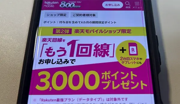 | 【ショップ限定】楽天回線をもう1回線お申し込みで3,000ポイントプレゼント! | 楽天モバイルショップにて、楽天回線をもう1回線申し込むと、3,000ポイントプレゼント |