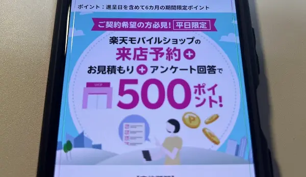 | 【ショップ限定】来店予約&店頭でお見積もり&アンケートに回答すると500ポイントプレゼント! | 楽天モバイルショップの予約、見積もり、アンケート回答で500ポイントもらえる※平日限定 |