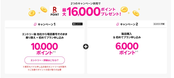 「初めてお申し込みで2,000ポイント還元!」と「楽天モバイル紹介キャンペーン(6,000ポイント)」の2つです。