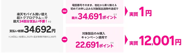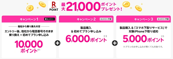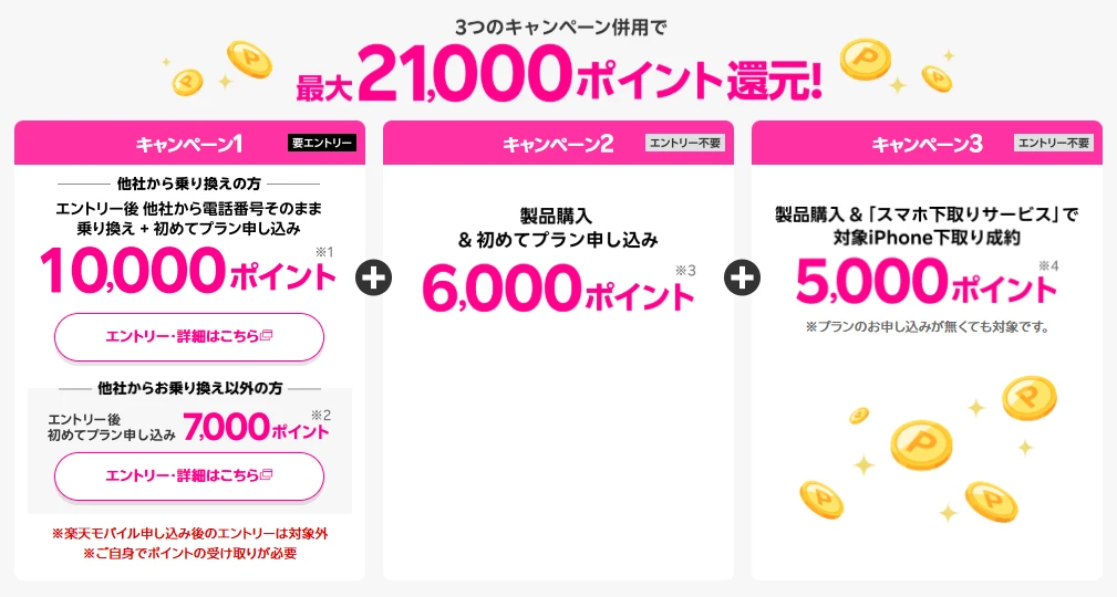| 楽天モバイル乗り換えキャンペーン! | 他社から乗り換え(MNP)で10,000ポイントもらえる ※エントリー必須 |