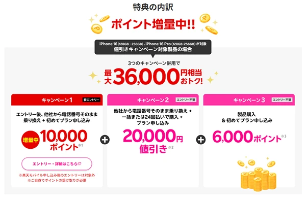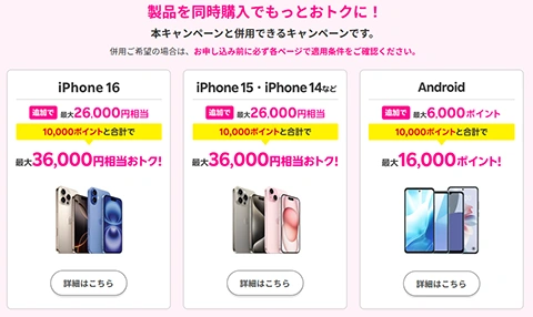 | iPhone 16シリーズキャンペーン!最大36,000円相当還元 | iPhone 16シリーズが最大36,000円相当お得に契約可能 |