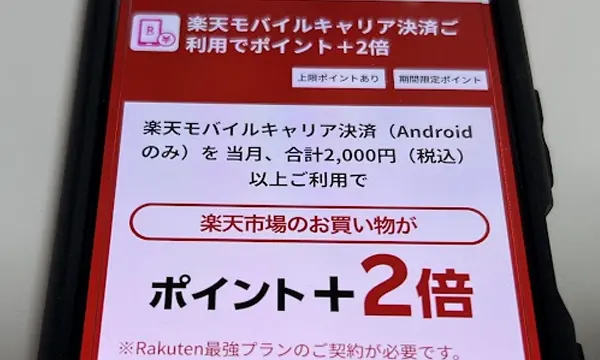 | 楽天モバイルキャリア決済で楽天市場のお買い物が+2倍(SPU) | 楽天モバイルキャリア決済(Androidのみ)にて、当月合計2,000円以上利用で、楽天市場のお買い物が+2倍になるキャンペーン |