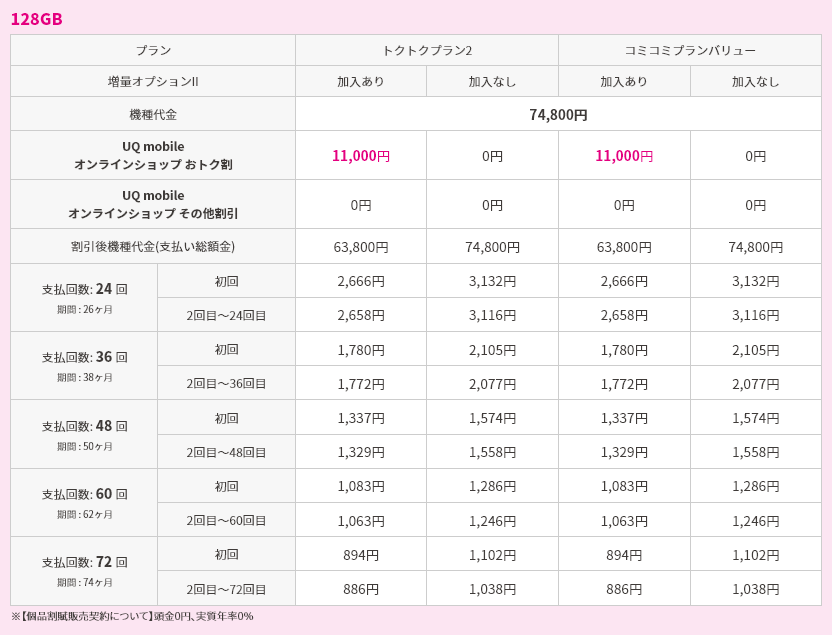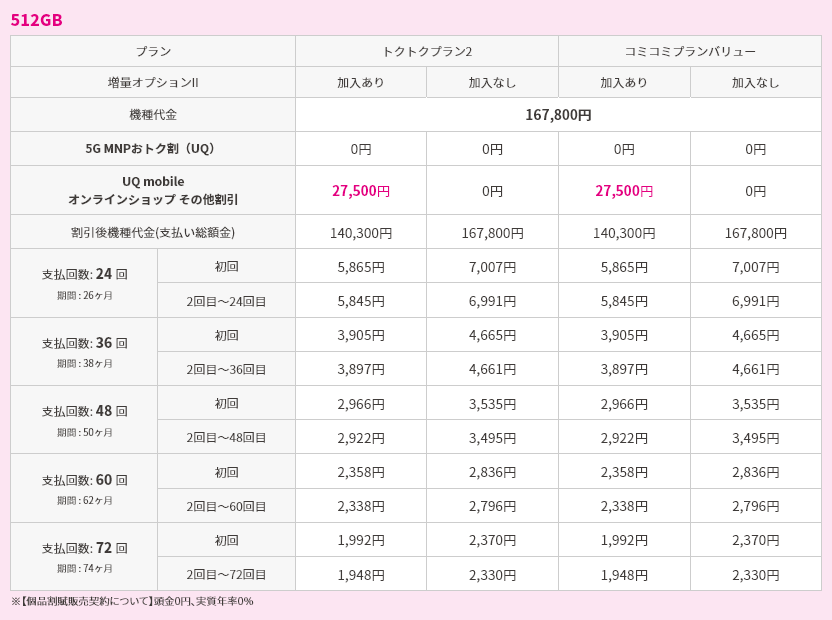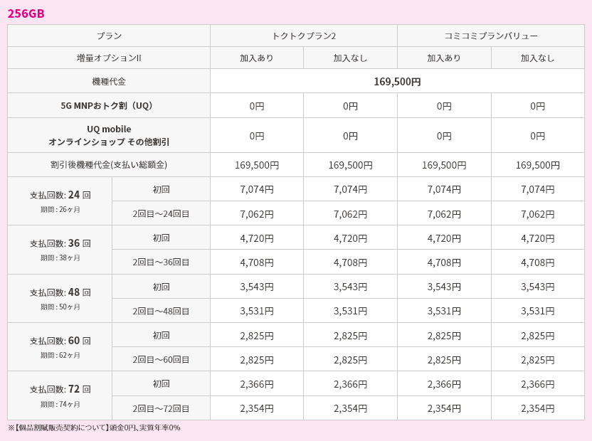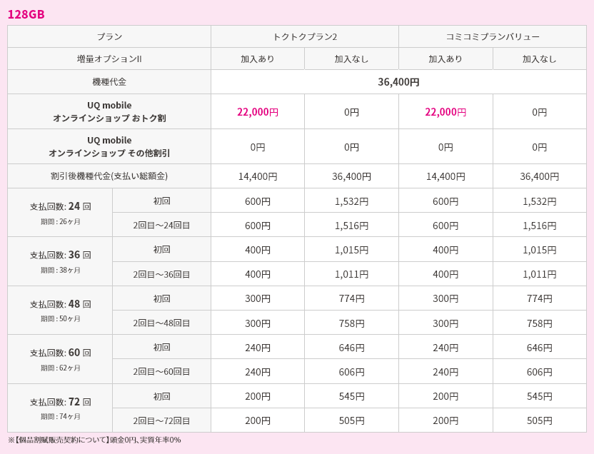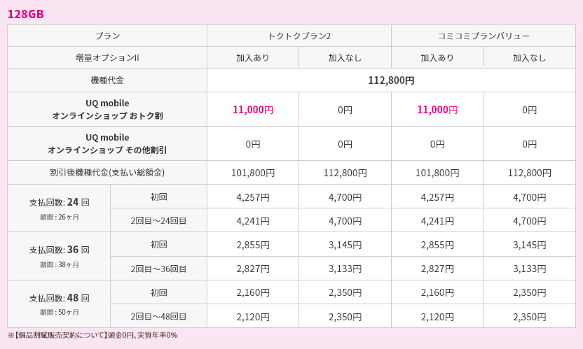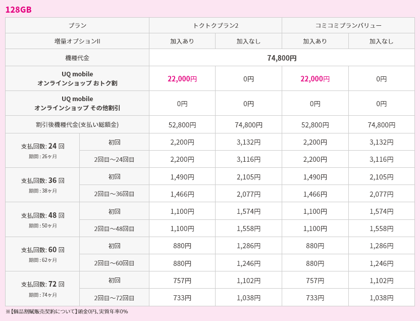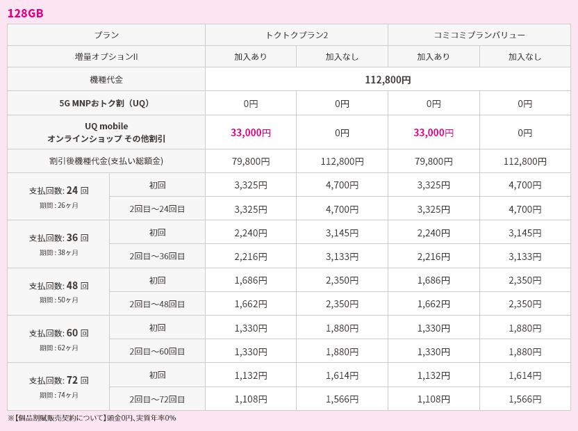 対象機種購入と同時にトクトクプラン2/コミコミプランバリューと増量オプションⅡへの加入で機種代金から割引価格で購入可能