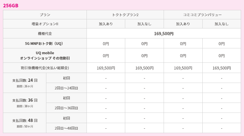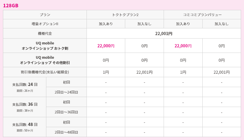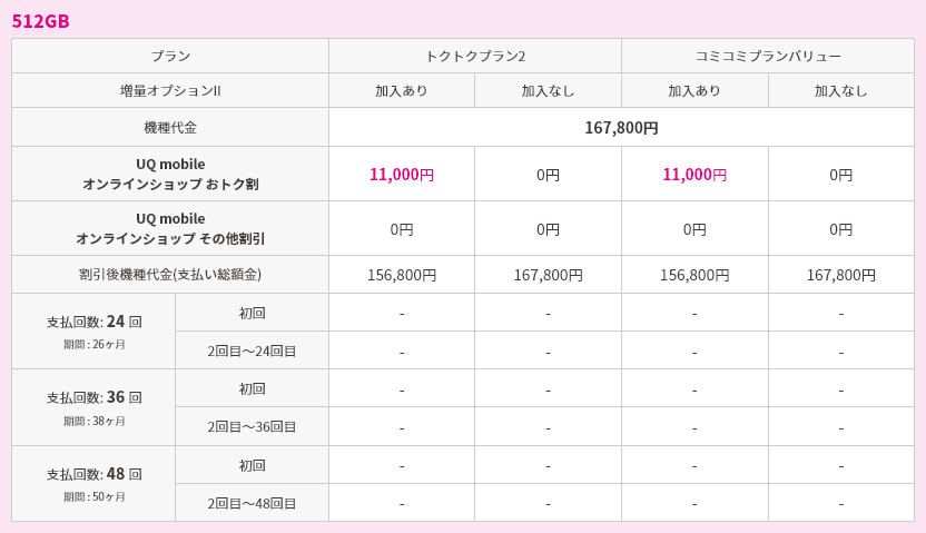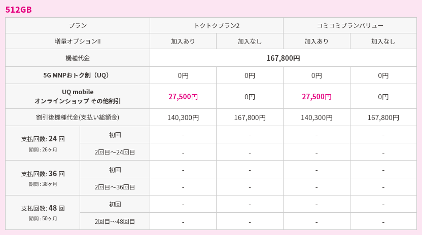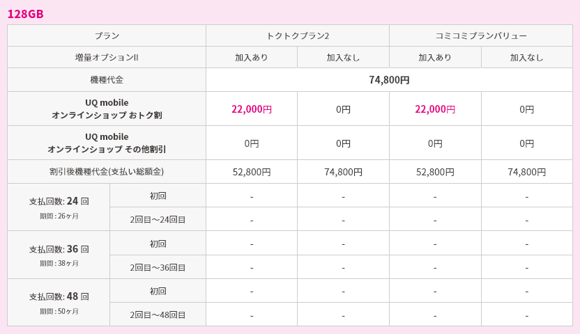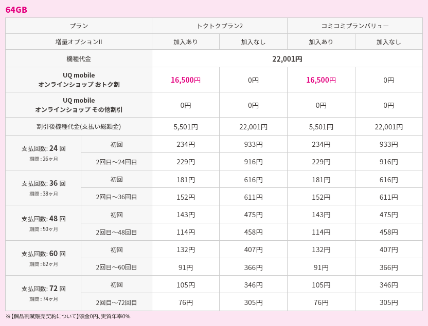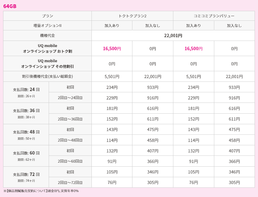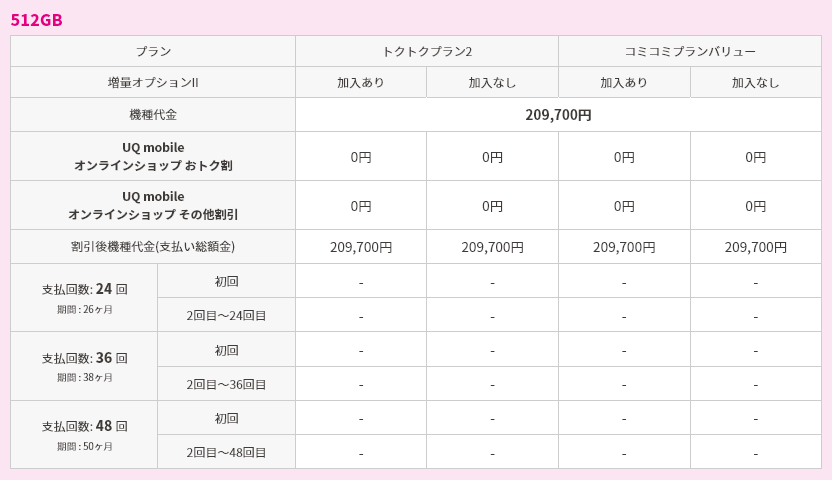 対象機種購入と同時にトクトクプラン2/コミコミプランバリューと増量オプションⅡへの加入で機種代金から割引価格で購入可能