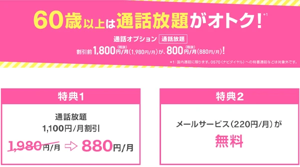 利用者が60歳以上の場合、トクトクプラン2または3Gからのりかえで通話オプション「通話放題」が1,100円割引(1,980円⇒880円)