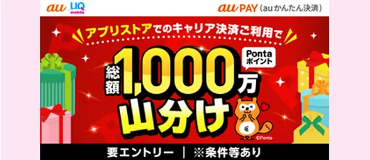 2025年冬のキャリア決済(auかんたん決済)キャンペーンau PAY(auかんたん決済)を利用すると、利用額に応じてPontaポイントがプレゼント