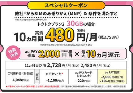 他社からSIMのみ乗り換えで2,000円相当×10カ月のauPAY還元