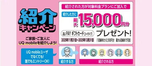 UQ mobile紹介キャンペーンUQ mobileに紹介すると最大15,000円相当のau PAYギフトカードがプレゼント