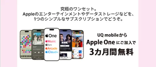 UQ mobileからApple Oneにご加入で、3カ月間無料!UQ mobileからApple Oneに加入で月額1,200円が3カ月無料