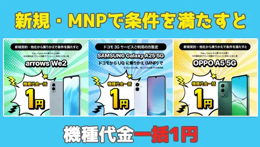 機種代金一括1円セールUQオンラインショップで対象機種を購入すると機種代金が一括1円で購入可能
