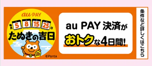 毎月5のつく日と8日はau PAY決済がおトクな、たぬきの吉日!au/UQモバイルを利用中の方が毎月5と8の付く日に対象店舗でauPAY(コード支払い)200円(税込)以上の利用で、最大3%Pontaポイント還元