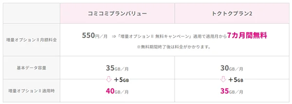 月額550円かかる増量オプションⅡが7カ月間無料で利用