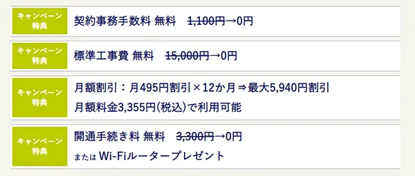 | キャンペーン | 工事費無料、月額料金割引、事務手数料無料、開通手続き料無料 |