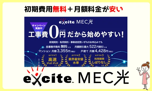 exciteMEC光(エキサイトMEC光)は、工事費無料で月額料金も格安で利用できる光回線です。
