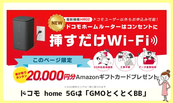 | 特記事項 | 20,000円相当のAmazonギフト券 本体代も月々サポート割で実質無料。 ドコモの携帯電話とのセット割「home5Gセット割」にも対応 |